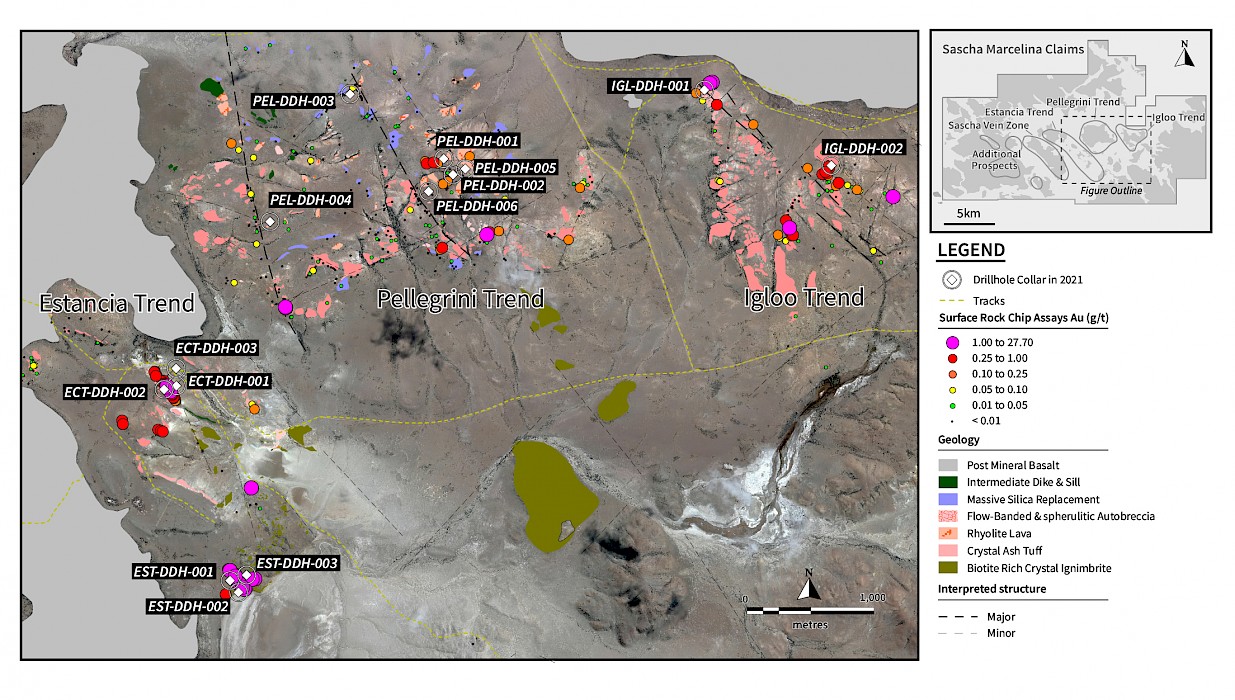 Mirasol’s President, Tim Heenan, commented: “We are encouraged with the early results from this maiden drill program on three of our priority prospects within the Sascha Marcelina project. The Pellegrini Trend returned a broad zone of Au and Ag mineralization overprinting a younger Pb and Zn rich base metal pulse, that is interpretated to represent the high-level expression in this epithermal system. This mineralized zone may correspond to the top or the margins of a hydrothermal breccia body, or possibly the upper zones of a larger mineralized and dilated structure at depth, spatially associated with a rhyolitic dome complex. Drilling on the Igloo and Estancia Trends also returned a number of anomalous Au and Ag intercepts, and improved our understanding of the local geological settings which will help in vectoring follow-up drill programs towards higher grade zones at depth and within a more permissive stratigraphic horizon.”
