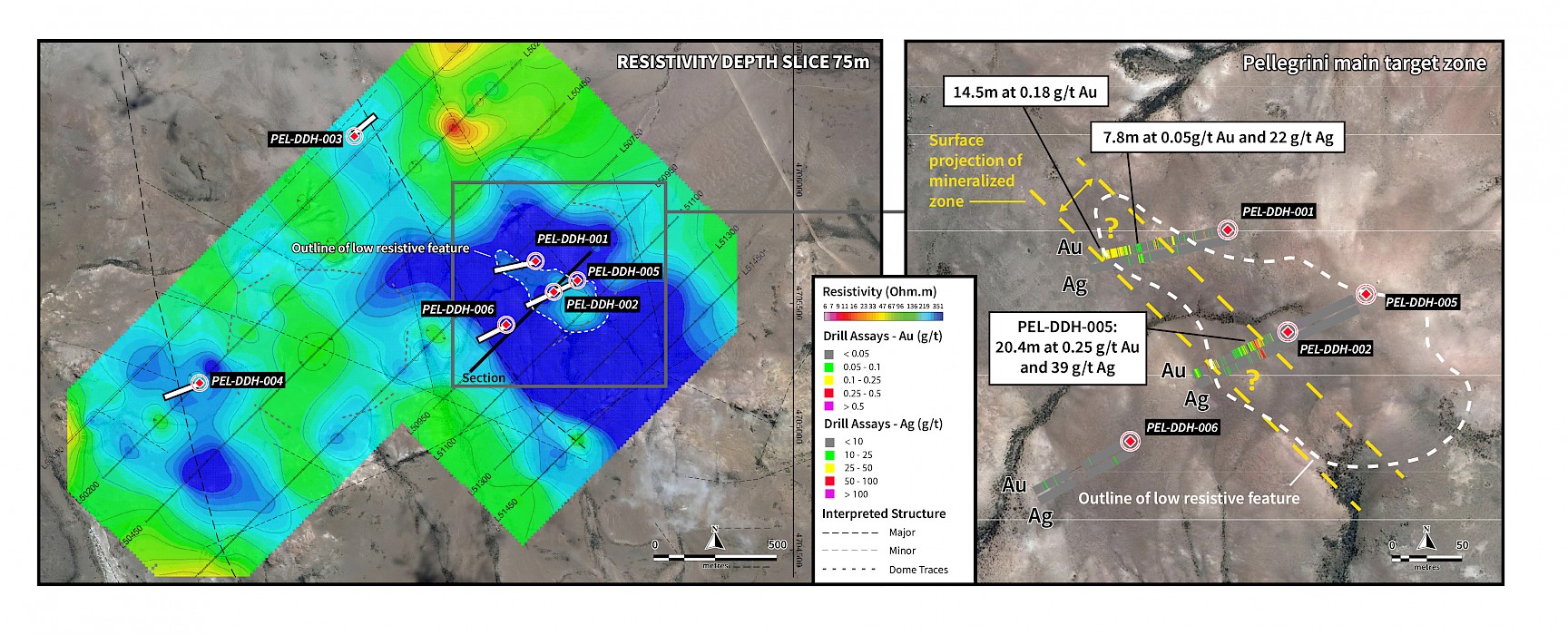 The widespread high resistivity anomaly present at Pellegrini also correlates well to the dome complex and related highly siliceous outflows mapped on surface. The innermost central “reduced” resistivity response corresponds with the mineralized hydrothermal brecciation, which is interpreted to be located along the outer limits of the dome margins in contact with pyroclastic volcanics. This reduced resistivity feature may represent the outline of the “top” of a larger mineralized breccia body, which has less pervasive silica compared to that of the surrounding host rocks (Figure 2).