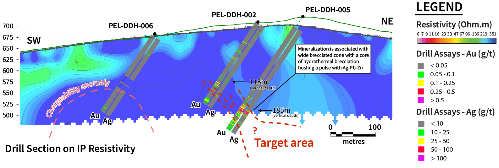 These results from PEL-DDH-005 are considered very encouraging as they represent a clear downward vector for the mineralization underneath the narrower, mineralized zones intersected in each of holes PEL-DDH-001 and PEL-DDH-002. Based on several geological observations, including the “peripheral” crackle brecciation, mineralization style and silica species, this intersection is interpreted to represent the peripheral or the upper part of an untested larger body of mineralization. Further drilling is required to confirm the geometry of this mineralized hydrothermal breccia body and how it relates to the local topography.