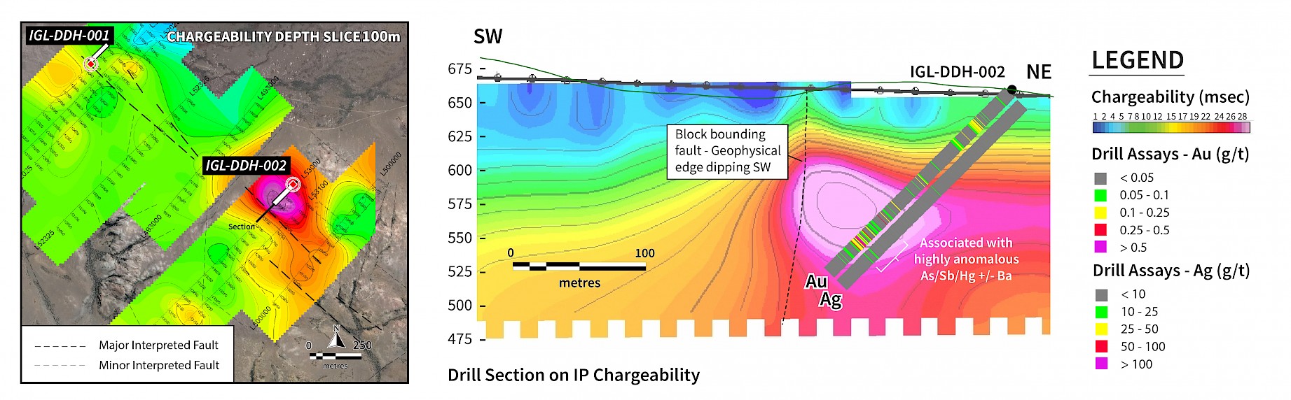 At the Igloo Trend, limited initial drilling intercepted mineralization very similar to that of Estancia Sur, related to narrow veinlets, zones of pseudo-stockwork and fluidized channels hosting brecciation, with Au grades up to 0.57 g/t. This mineralization is associated with a pronounced and widespread “cloud” of pathfinder elements characterised by arsenic, antimony and mercury + barium (Figure 5). Such zones of anomalous pathfinder elements typically reside above productive systems in several low sulfidation Au-Ag epithermal mines and deposits in Santa Cruz and provide a strong vector to depth for stronger mineralization.