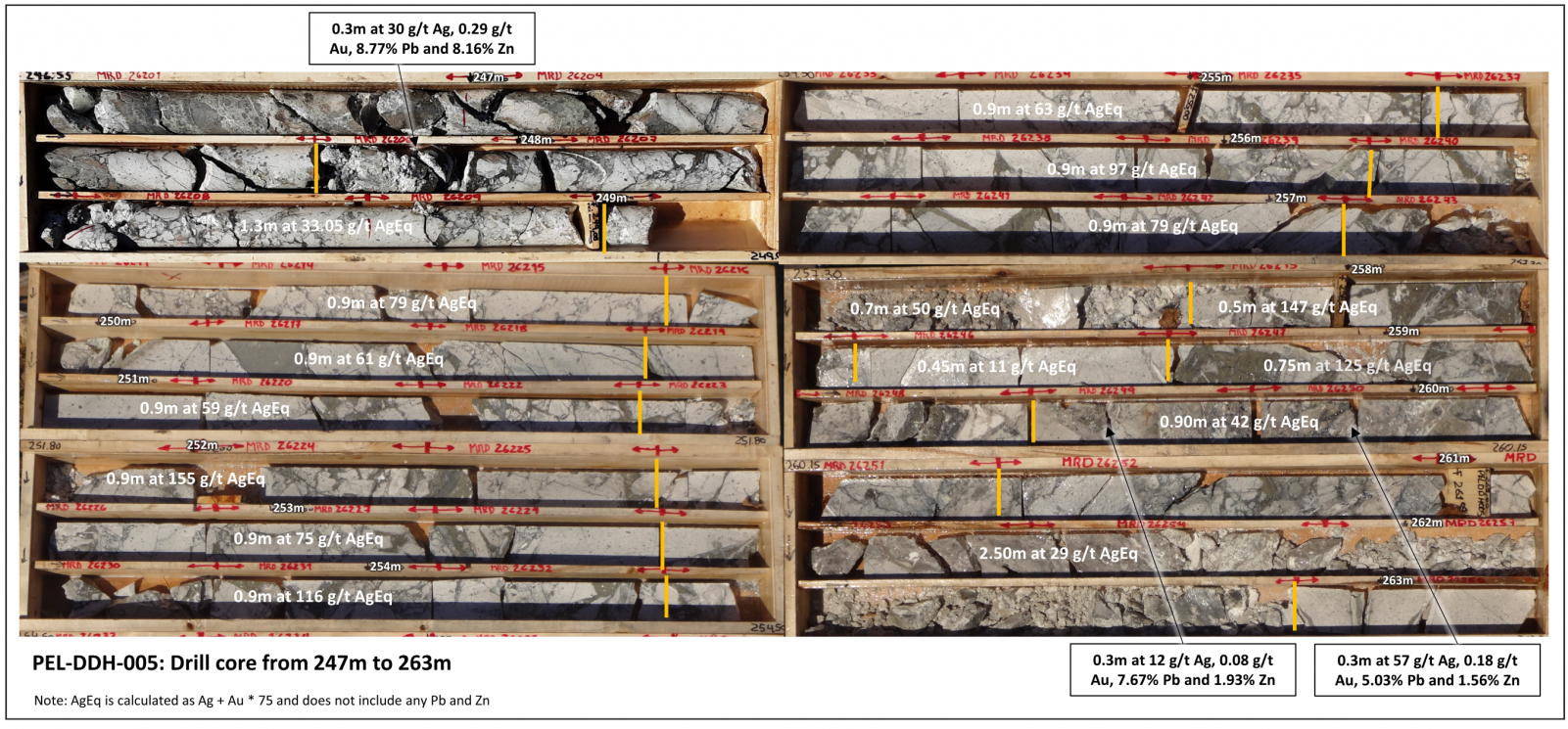 Holes PEL-DDH-001, PEL-DDH-002 and PEL-DDH-005 were drilled at the Pellegrini main target zone located on the top of a prominent hill, resulting in an 80-100m elevation difference between the hill and the nearby topographic flats. They all encountered within their upper levels, restricted zones of anomalous mineralization associated with hydrothermal brecciation. Hole PEL-DDH-005, which was drilled deeper below PEL-DDH-002, exhibits the best mineralized intersection to date. A wide zone of peripheral crackle brecciation starts at 170m vertically below surface and continues into an inner core of hydrothermal polymictic brecciation for a total intercepted width of brecciation >25m. This inner zone returned an intersection of 20.4m at 0.24 g/t Au and 39 g/t Ag (58 g/t AgEq[1]) from 242.5m, including 10.5m at 0.28 g/t Au and 66 g/t Ag (87 g/t AgEq) from 249m. High Zn and Pb base metal results are also associated with this brecciated body with 0.82% Pb and 0.7% Zn over the broader 20.4m interval, including 1.3m with 3.19% Pb and 2.56% Zn (Figure 3, Table 1, 2 and Photo 1).