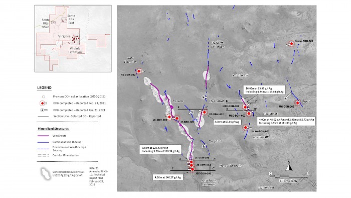 Phase I drilling completed at Virginia in late 2020, which encompassed 18 drill holes for a total of 2,831m, confirmed the potential to identify new well-mineralized structures that were not previously included in the NI 43-101 resource. All the drilling in Phase I, except for the holes at the Magi target, focused on potential strike extensions along the known trends that host the current resource and also previously untested vein structures.