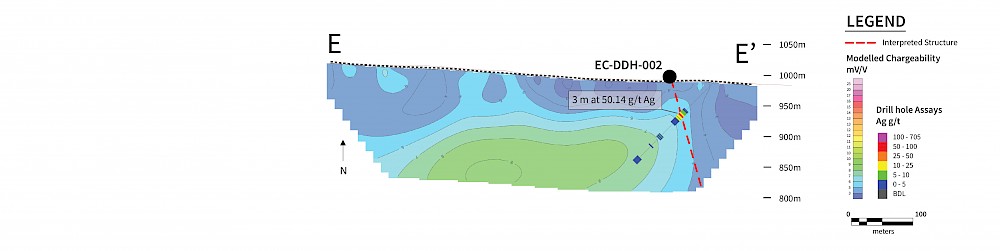 The Ely Central hole EC-DDH-002 intercepted hydrothermal breccia with wall rock fragments returning up to 60 g/t Ag and outward halos of crackle hydrothermal breccias with silica hematite cement with up to 30 g/t Ag. As mentioned above, these hematite cemented breccias are generally believed to be high up in the vein system or represent weaker mineralized sections of the hosting structure between the mineralized shoots. A lower grade, anomalous intersect of 3.00m at 50.14 g/t Ag was returned from this hole.