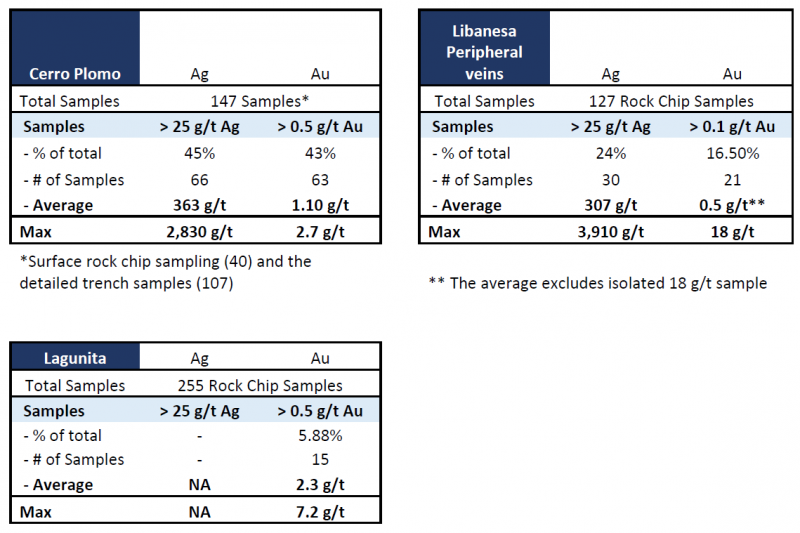 Libanesa is a drill ready project hosting several diversified geological, geochemical and geophysical supported drill targets. Cerro Plomo is the principal target and is characterized by a well mineralized Au/Ag hydrothermal breccia that is exposed at surface, and supported by both chargeability and resistivity geophysical anomalies at depth. Peripheral polymetallic veins at the Libanesa Main prospect represent secondary targets and are supported by strong base metal +/- Au mineralization. The Lagunita prospect is a third prospective zone, which has reported some encouraging rock chip Au values from more typical low sulfidation type epithermal veins and breccias. This prospect requires additional surface exploration to vector into the potentially better mineralized parts of this extensive vein system, where intermittent vein occurrences, outcropping/subcropping through post mineral cover, have been mapped over a strike length of at least 2.3 km.