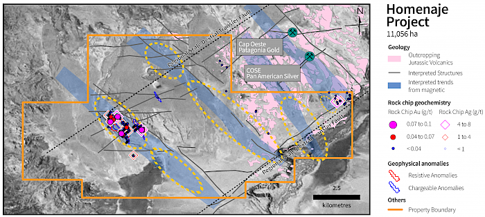 The Homenaje project covers 10,056 ha and is located at the western margin of the Deseado Massif Au-Ag metallogenic province, just 3km south and southwest from the COSE and Cap Oeste mines operated by Pan American Silver and Patagonia Gold, respectively.