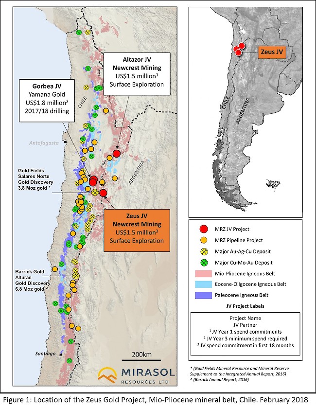 VANCOUVER, BC, February 26, 2018 — Mirasol Resources Ltd. (TSX-V: MRZ, OTCPK: MRZLF) (the “Company” or “Mirasol”) is pleased to announce that it has signed a binding letter agreement (the “Agreement”) for the Company’s 18,480 ha Zeus High-Sulfidation Epithermal (HSE) gold project in Chile, with Newcrest International Pty Limited, a wholly owned subsidiary of Newcrest Mining Limited (ASX: NCM). NCM has the right to acquire, in multiple stages, up to 80% of the Zeus Project by completing a series of exploration and development milestones and making staged option payments to Mirasol of US$1 million. NCM will spend a minimum of US$1.5 million at Zeus over an initial 18-month period, and has also agreed to fund costs arising from an option to purchase agreement (see new release January 16th 2018) entered into by Mirasol with the underlying owner of a 2,500 ha portion of 3rd party claims at Zeus.