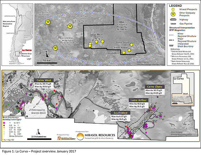 La Curva (Figure 1) is a 36,100ha exploration-stage project located at low elevation in an area with favorable infrastructure in Santa Cruz Province, Argentina. Mirasol has undertaken an extensive exploration and geophysical program at the property over a number of years, which has outlined three priority drill ready prospects (see news releases, January 23, 2014 and April 11, 2008). The prospects include the Cerro Chato, Loma Arthur and South West targets situated along the Company’s 6 km “La Castora” gold trend; a series of additional prospects are also recognized in the Curva West area which warrant further exploration to define additional drill targets.