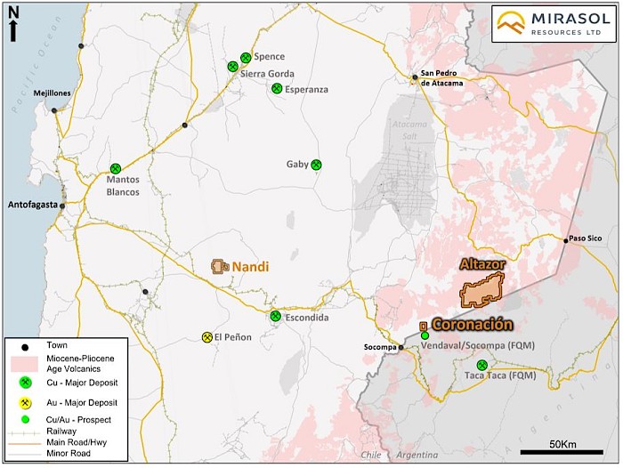 “First Quantum’s inability to meet the minimum drilling requirement under the Agreement provided the opportunity for us to regain 100% unencumbered control over the highly prospective Coronacion Project. Evidence of extensive, closely spaced definition drilling over a 2.25 km2 area at First Quantum’s Vendaval Project directly across the Argentine border greatly increases the significance of the drill-ready targets at Coronacion”, Mirasol’s President, Tim Heenan, commented. “Apart from Coronación, there are other exceptional prospects in the immediate vicinity, including our Altazor HSE/Porphyry Gold/Copper Project, adding to the district potential of this region in northern Chile.”