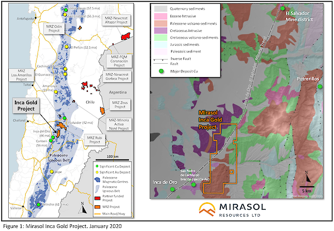 VANCOUVER, BC, January 13, 2020 — Mirasol Resources Ltd. (TSX-V: MRZ) (OTCPK: MRZLF) (the “Company” or “Mirasol”) is pleased to announce the signing of an option agreement (the “Agreement”) with subsidiaries of Newmont Corporation (NYSE: NEM, TSX: NGT)(“NEM”) to acquire the Inca Gold Project (the “Project”) in Northern Chile. This Agreement gives Mirasol the opportunity to add to its portfolio a district-scale and underexplored, intermediate sulfidation epithermal project in the prolific Paleocene belt of Chile. The Project hosts multiple attractive targets that have never been drill tested, and it fits well with the Company’s strategy to fund drilling on high quality prospects with favorable infrastructure.