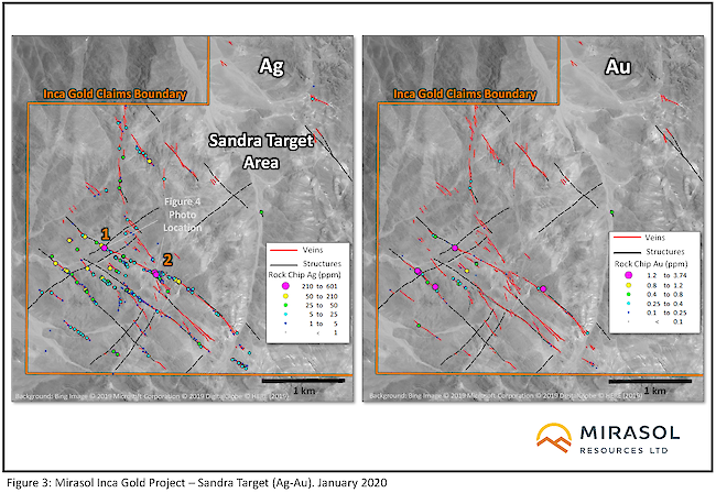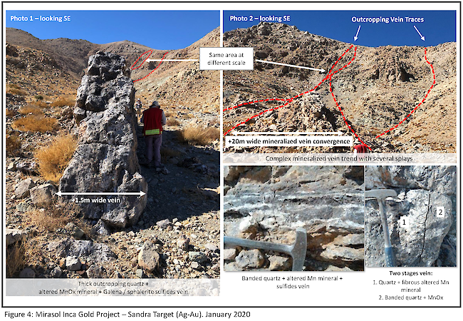 Located at the southwestern border of the property, Sandra is the better-known target where a large hydrothermal system with development of intermediate sulfidation mineralization has been recognized. Mirasol will initially focus most of its exploration efforts on this prospect. Mineralization at Sandra comprises of at least five subparallel trends striking NW within an area of 2.5 kilometers x 4 kilometers, with continuous individual vein trends extending over lengths of up to 1.2 kilometers with wide individual veins (up to 3 meters) and intervening sheeted vein zones (20 meters) (see Figures 3 and 4). Vein textures are comprised of brecciated and crustiform-colloform banding with commonly bladed textures. Multiple pulses of vein fill is observed with a first stage of crystalline quartz with elevated Cu-low Au grades, generally occupying the margin of the veins at the contact with host rocks, and a second stage of colloform-crustiform banding with fine-grained quartz and abundant Mn oxides, sulfide-rich bands (now completely leached and replaced by hematite), high Ag-Zn-Pb (±Au) values, including: