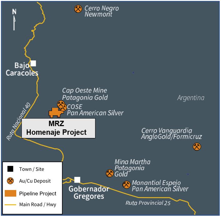 The Homenaje project covers 11,056 ha and is located at the western margin of the Deseado Massif Au-Ag metallogenic province. With the completed surface surveys, 4 northwest trending prospective structural trends are identified, with similar geologic characteristics to those of the adjacent COSE and Cap Oeste mines.