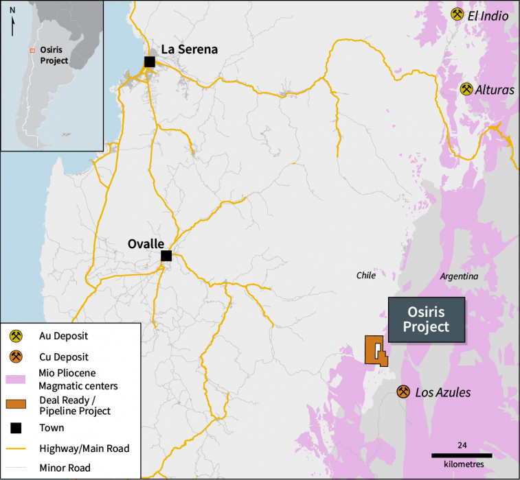 At the regional level, Osiris is located within the southern extension of the Miocene Age El Indio high sulfidation epithermal belt and northern extension of the Southern Miocene porphyry belt, both of which are well-endowed regions in Chile and Argentina. Mineralization at Osiris appears to be controlled by the same prominent northwest striking lineament, a key regional feature which also controlled the emplacement of the late Miocene Los Azules, an advanced-stage porphyry Cu project (McEwen Mining Inc - Indicated Resources: 10.2 B lbs at 0.48% Cu and 1.7 Moz at 0.06 g/t Au[1]) located some 17 km to the southeast.