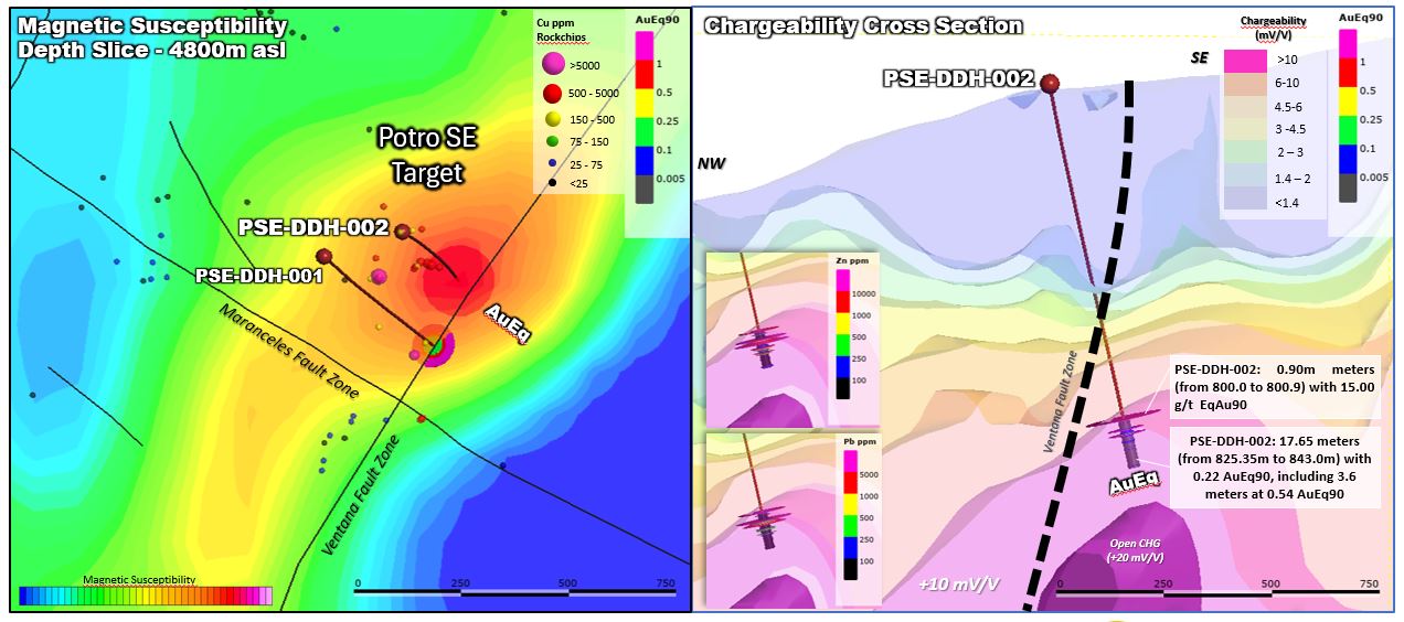- Second drill hole testing the Potro SE target intersected the continuation of a polymetallic hydrothermal breccia system: 0.90m at 15.02 g/t gold Eq and 17.65m at 0.22 g/t gold Eq with high silver, lead, zinc and indications of copper