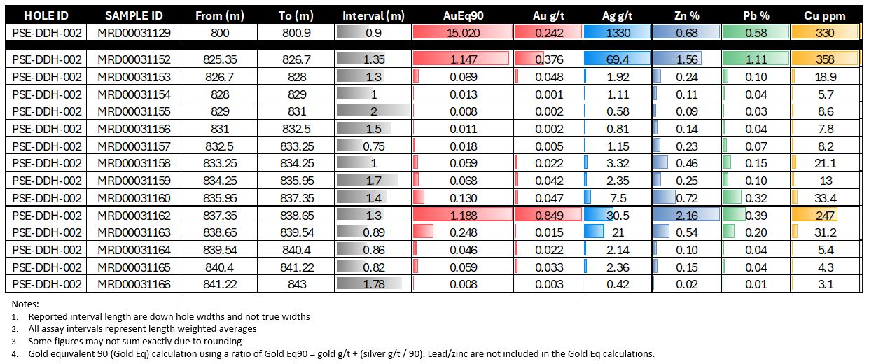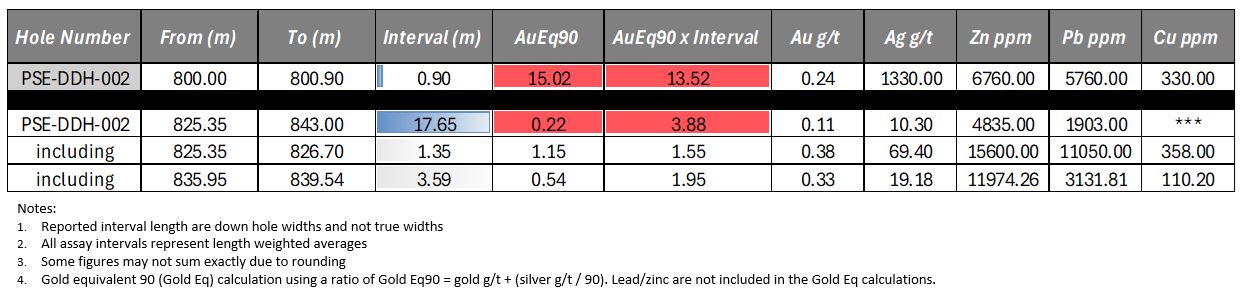 - 0.90m (800.30–801.20 m) with 15.02 g/t gold equivalent 90 (“gold Eq”) (0.24 g/t gold and 1,330 g/t silver) and 0.68% zinc and 0.58% lead.
