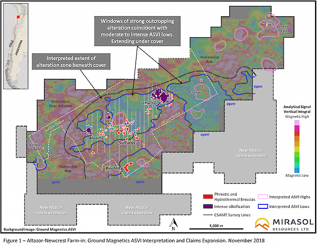 Alteration and breccias outcrop intermittently along a 15 km long NE-oriented range front that is interpreted as a series of large fault scarps. The 207 sq km ground magnetic survey completed over the project, shows a series of large magnetic depletion zones, correlating with the mapped areas of alteration, that are separated by the magnetically distinct post alteration volcanics (Figure 1). It is interpreted that the post alteration volcanics partially “mask” the magnetic depletion signature of the underlying alteration, suggesting the Altazor system may cover a much larger area and be open to the south into the new claims recently staked by the NCM and Mirasol.