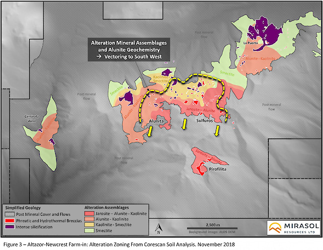 - Claims extension: 2017/18 exploration results identified potential covered extensions of the Altazor alteration system. NCM and Mirasol have recently staked approximately 10,000 ha of new claims expanding the project by approximately 30% to a total of 33, 230 ha.