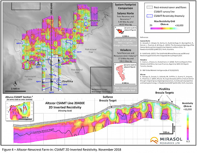 Analysis of the Altazor data sets outlines alteration mineral composition variation and low detection limit soil geochemistry anomalies, highlighting predictive patterns that vector towards a series of covered and predominantly open-ended, very resistive (7,500 to >30,000 Ohm-m) CSAMT geophysical anomalies at the Alunita, Sulfuros and Pirofilita prospects (Figure 4). These anomalies define large-scale targets that have the form, dimensions and intensity of resistivity response that could indicate a series of silicified breccia and or vuggy silica bodies. The association of Altazor mineral chemistry and soil geochemistry vectors, and CSAMT resistivity anomalies define a series of high priority conceptual targets for large scale HSE gold mineralization4, that will be the focus of the planned 2018/2019 maiden drill campaign.