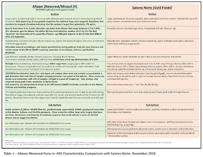 The 2017/18 Altazor exploration results highlight the large areal extent of the alteration system at the project that will require several seasons to complete a first pass evaluation. The integrated leading-edge technologies applied during the first season’s exploration, have identified multiple compelling large-scale drill targets in three principal prospects that have alteration, geochemical and geophysical characteristics in common with the predrill target signatures of Salares Norte (Table 1) and other recent HSE gold discoveries.