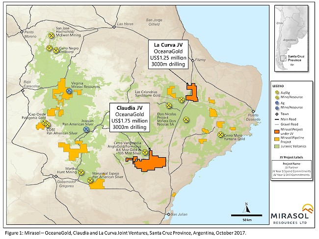 Oceana Gold Corporation (OGC) is a multi-national, high margin gold producer with an expanding precious metal production profile from its operations in the United States, New Zealand and the Philippines. Mirasol and OGC are already partnered in an existing option agreement (JV) signed on May 18, 2017 for the La Curva project which is also located in Santa Cruz Province, Argentina – the La Curva JV has a first year spend commitment of US$1.25 million (see news release May 25, 2017).