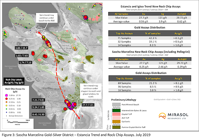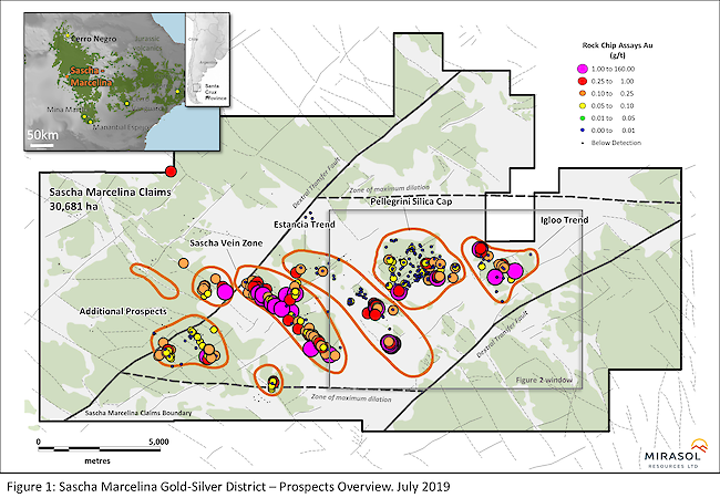 VANCOUVER, BC, July 18, 2019 — Mirasol Resources Ltd. (TSX-V: MRZ) (OTCPK: MRZLF) (the “Company” or “Mirasol”) is pleased to announce updated surface exploration results from its Sascha Marcelina Low Sulfidation Epithermal (“LSE”) gold-silver project in the Santa Cruz Province of Argentina. The project is located 100 km south of Newmont Goldcorp’s Cerro Negro mine and displays similar geologic and geomorphic settings.