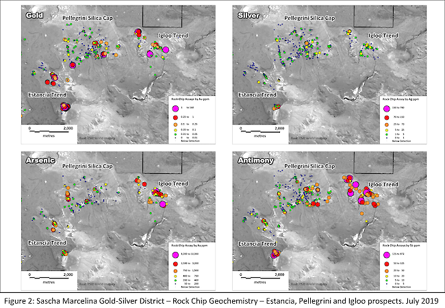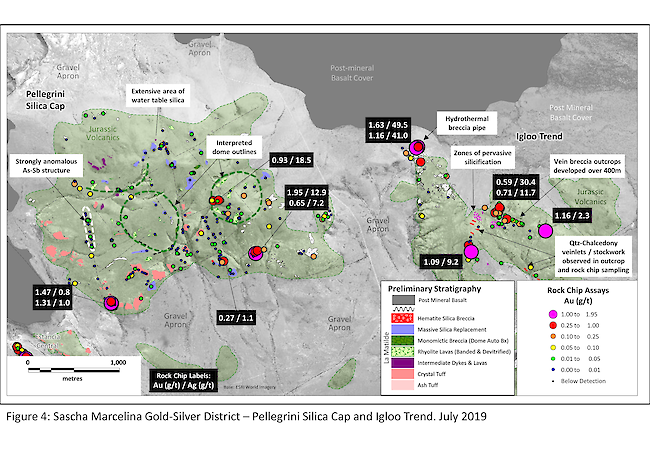 The surface exploration activities completed this field season on the Sascha Marcelina project include geological mapping aided by the acquisition of drone supported high-resolution base images, detailed rock chip sampling, extensive soil grid sampling (with PXRF sourced geochemistry) and the acquisition of alteration data using in-house handheld ASD (Analytical Spectral Devices) technology on all of the rock chips and soil samples collected to date. This recent work has defined a large alteration footprint of more than 20 km2, located in the immediate vicinity of the Marcelina claims, and hosting an epithermal silica vein system with multiple mineralized trends. Within this area, new prospects have been recognized, with the “Estancia Trend” and the “Igloo Trend”, both located in close proximity to an extensive silica cap (the “Pellegrini Silica Cap”), which is interpreted as representing the preserved fossil paleosurface of a low sulfidation system (Figure 1).