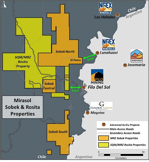 - The eastern portion of the Rosita Property is 3km directly west of Filo Mining’s Filo del Sol Project and Sobek North is 3km southwest of NGEx´s Lunahuasi discovery