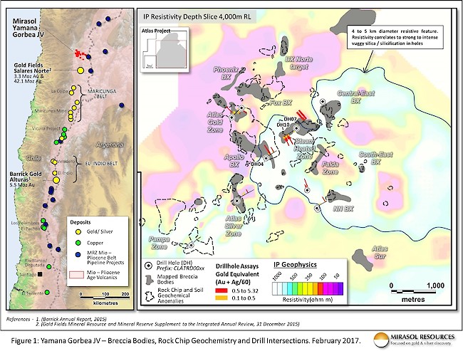 Vancouver, BC, 08 February, 2017 – Mirasol Resources Ltd. (TSX-V: MRZ, “Mirasol”) is pleased to announce that Yamana Gold Corporation (Yamana) has commenced the 2nd year of exploration at the Gorbea JV, completing a systematic surface mapping program in December 2016 and initiating a minimum 3,500 metre, eight hole drilling program on January 17, 2017 at the Atlas gold-silver project Chile.