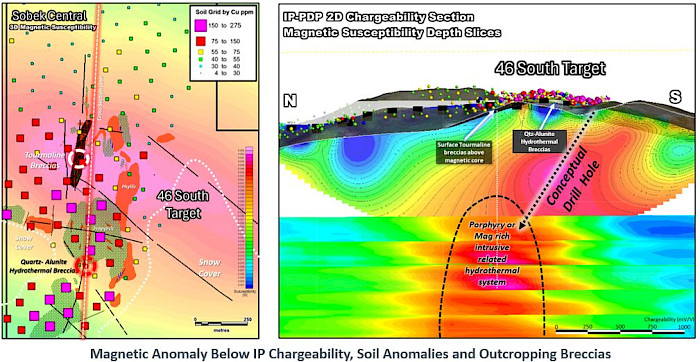 Located at the south end of Sobek Central, the 46 South target resides on the southern margin of a district-scale magnetic high where both the airborne MT and magnetics surveys outlined distinct cylindrical anomalies. The grid-based soil survey outlined a coincident prominent, large and coherent copper-gold-moly geochemical anomaly on surface that directly overlays IP-PDP resistivity and chargeability responses from IP ground geophysics surveys completed late last season. Structurally controlled tourmaline breccias and hydrothermal breccias were also identified while prospecting and mapping in the target area (news release dated Sep 16, 2025).