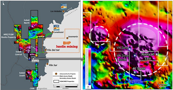 - Located just 7 km west of Filo del Sol in the Vicuña District, the 46 South target is at the south end of a 3 km N-S trending corridor of mineralization at Sobek Central