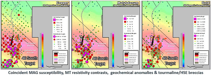 - The 46 South epithermal and underlying porphyry target sits on the margin of a district scale magnetic high where coincident mag-susceptibility, MT anomalies and ground-based IP responses lie directly below a large soil survey geochemical anomaly where hydrothermal and tourmaline breccias outcrop on surface