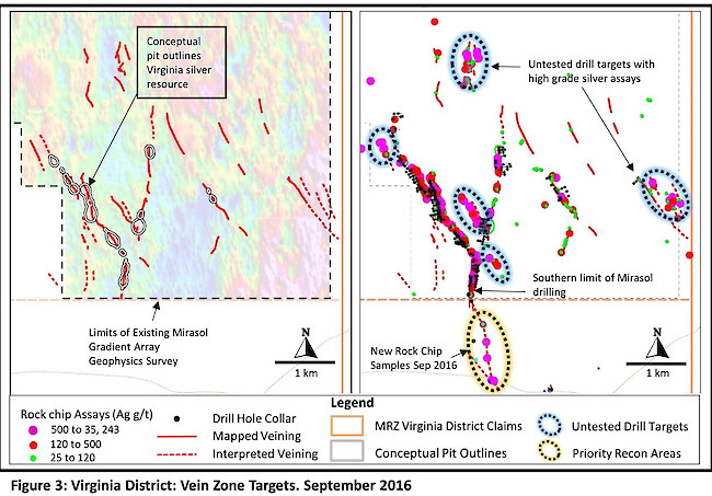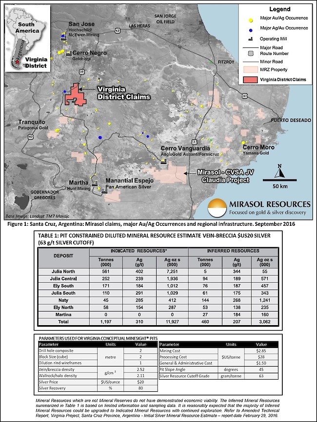 Mirasol Resources is actively seeking a Joint Venture partner to advance exploration drilling and evaluate the potential to develop the Virginia Silver project. This would include testing of a range of undrilled silver targets adjacent to the existing resource, systematic exploration and potential drill testing of targets on the new claims and the evaluation of the potential to mine and truck the Virginia mineralization to one of the existing mine processing facilities in Santa Cruz province.