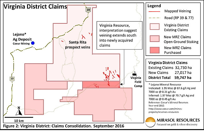 VANCOUVER, BC, September 14, 2016 — Mirasol Resources Ltd. (TSX-V: MRZ, OTCPK: MRZLF, Frankfurt: M8R) (the “Company”). Mirasol Resources has expanded its claims holdings in the Virginia silver district in Santa Cruz Province Argentina via open ground staking and the purchase of mineral rights from a privately owned prospecting company (Figure 1). The newly acquired claims add a total of 27,017 ha to Mirasol’s holdings at Virginia (Figure 2), bringing the total area of contiguous claims controlled by Mirasol in the district to 59,747 ha. Mirasol retains 100% of all mineral rights to the new claims, with no royalties or payments due beyond the US$ 178,000 purchase price for the 3,009 ha claim block payable to the original property owner.