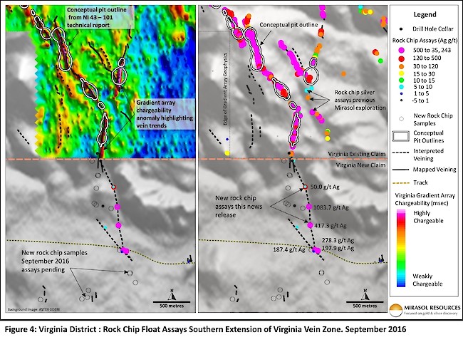 Drilling at Virginia by Mirasol between 2010 and 2012 defined an open-pit constrained Indicated resource of 1,197 Mt at 310 g/t Ag (11.9 Moz), and additional Inferred resources of 460 kt at 207 g/t Ag (3.1 Moz) at the Virginia silver project (Table 1; see news release March 29, 2016, and Amended NI 43 -101 technical report filed February 29, 2016) which are 100% owned by Mirasol Resources. Preliminary prospecting south of the limit of Mirasol drilling on the newly acquired lands (Figure 3), has identified quartz vein and vein breccia float scattered along a 2 km trend. The float samples have epithermal textures which are similar to those which characterize the outcropping Virginia vein zone. Results from 11 rock float samples collected along this trend include six samples with assays ranging from 50.0 to 1,084 g/t Ag (average 369 Ag g/t; Figure 4). Assay results from additional reconnaissance samples collected along this trend are pending. Field relationships and assays received to-date suggest that the new claims may host previously unrecognized soil-covered extensions of the Virginia silver system.