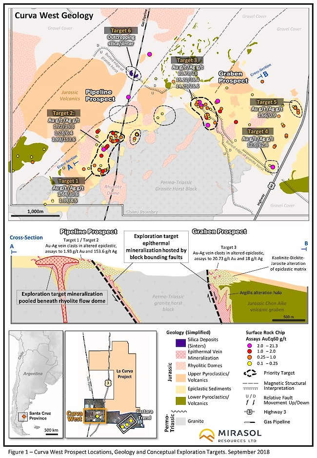 VANCOUVER, BC – September 19, 2018 — Mirasol Resources Ltd (TSX-V: MRZ) (OTCPK: MRZLF) (the “Company” or “Mirasol”) has received the US$200,000 option payment confirming that OceanaGold Corporation (TSX: OGC) (ASX: OGC) will continue into the 2nd year of the La Curva Joint Venture (JV), Santa Cruz Argentina. OGC has met the first-year minimum JV commitments spending approximately US$ 1.50M to the end of May 2018 (against US$ 1.25M committed) and drilling 3,020 m at the Castora Trend (see news release May 25th 2017).