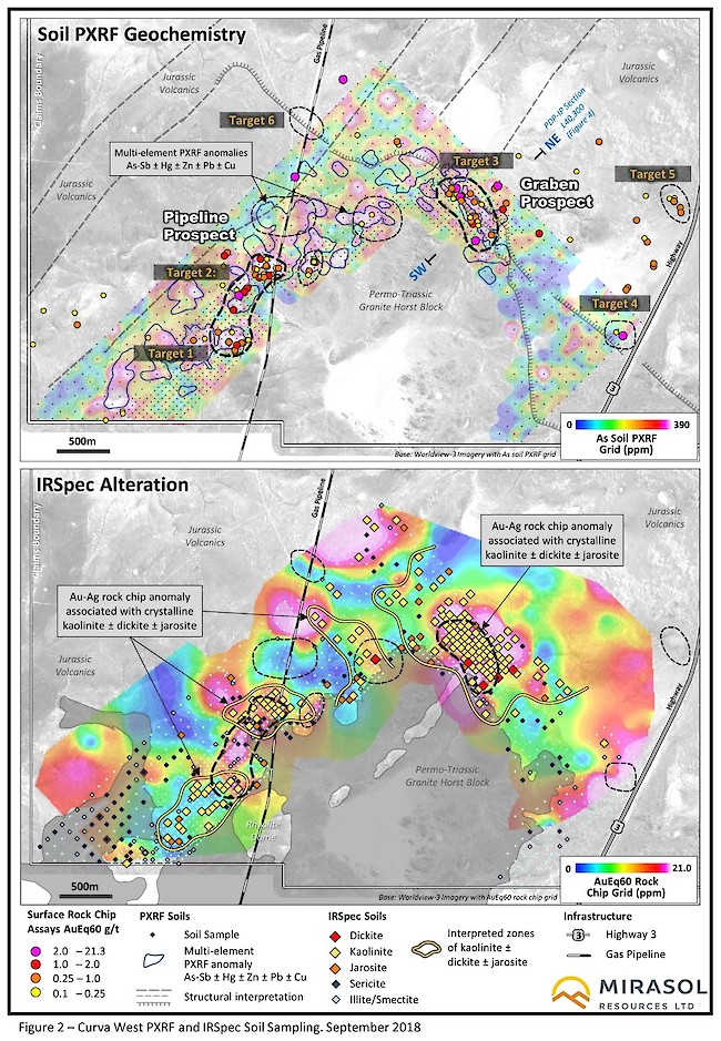 PXRF geochemical grid soil sampling of the epiclastics over Curva West prospect (Figure 2) delineated areas of coincident epithermal pathfinder (As+Sb+Hg ± base metals) anomalies in the soils often at sites coincident with clusters of Au+Ag bearing clasts. Handheld infrared spectrometer (IRSpec) alteration studies of the soils also showed the epiclastic matrix to be hydrothermally altered to an argillic mineral assemblage (kaolinite – dickite) characteristic of the upper levels of a classic epithermal alteration system.