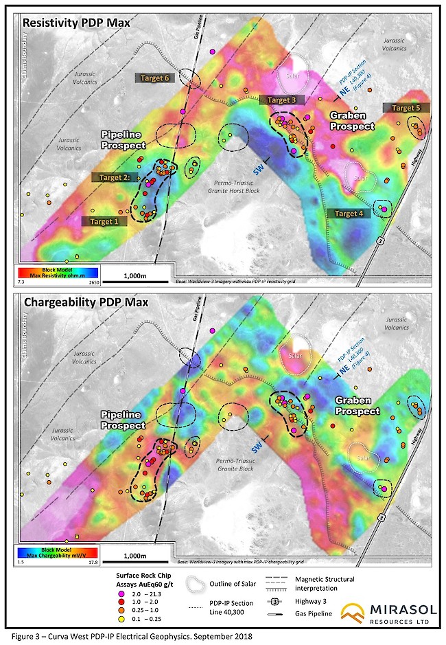3D models of ground magnetics and IP electrical geophysics were generated from a combination of existing Mirasol data and new surveys completed this season under the OGC JV (Figure 3 and Figure 4). The models show features that support the horst and graben geological setting for Curva West and the SouthWest prospects, and have been integrated with other datasets to select and prioritize drill targets for this season’s program.