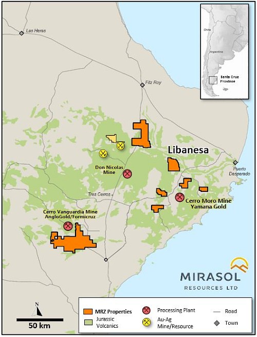 Libanesa is a 14,500-ha gold-silver (lead-zinc) project discovered by Mirasol. It is located at the north-eastern margin of the Deseado Massif gold-silver metallogenic province, approximately 70 km west of the port of Puerto Deseado, 40 km northwest of the Cerro Moro Gold-Silver Mine operated by Yamana Gold and 100 km northeast of the Don Nicolas Gold-Silver mine operated by Cerrado Gold.