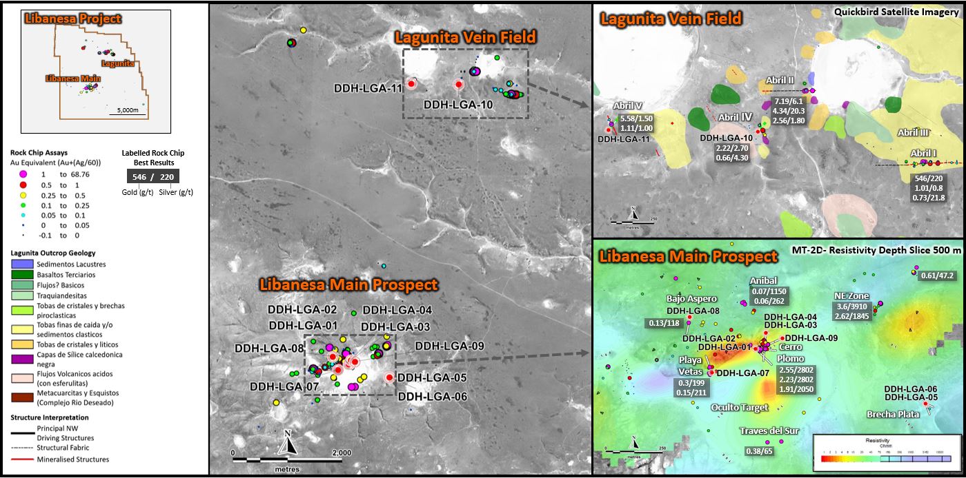 The project hosts two main prospective areas, Libanesa Main and the Lagunita Vein Field. Libanesa Main hosts the Cerro Plomo, Oculto, Traves del Sur, Bajo Áspero, Playa Vetas, Brecha Plata and the NE Zone prospects. Libanesa Main, and in particular Cerro Plomo, are more intermediate sulphidation in character while Lagunita is a classic gold-rich, low sulphidation epithermal vein prospect.