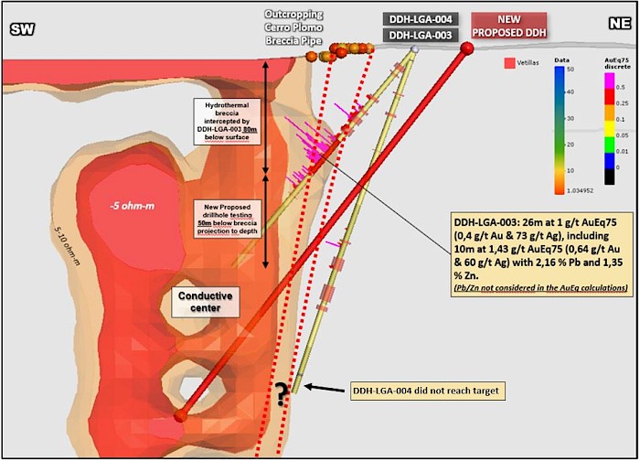 - DDH-LGA-003: Hydrothermal Breccia Zone 26m at 0.98 g/t AuEq75 (0.38 g/t Au & 44.7 g/t Ag), including 10m at 1.43 g/t AuEq75 (0.64 g/t Au & 59.3 g/t Ag) with 2.16 % Pb and 1.35 % Zn