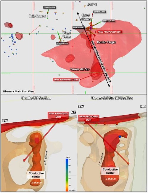 Hole DDH-LGA-003 drilled through the resistive halo of the conductive zone and returned strong mineralization with gold-silver and lead-zinc. The hole only just started to penetrate the conductive anomaly before ending. Hole DDH-LGA-004 was drilled at a steep angle under DDH-LGA-003 and appears not to have reached the target, neither intersecting the resistive halo nor the conductive zone. A follow up step-back hole is highly recommended to test these zones and also to pass completely through the entire conductive anomaly to test for higher grade gold-silver mineralization, which no hole to date has accomplished.