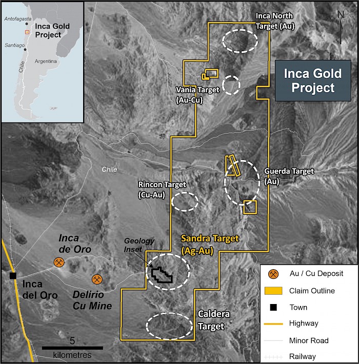 The 16,300 ha Inca Gold project is located in Region III of Chile, approximately 100 km north of Copiapo, and within the Inca Del Oro mining district that hosts both Santiago Metals Delirio Cu/Au mine and PanAust/Codelco’s Inca de Oro Cu/Au porphyry deposit. Inca Gold lies between 2,000 to 3,000m ASL and has good access allowing for year-round exploration. Mirasol’s initial exploration at the Sandra prospect has defined five Au/Ag prospects, none of which have been drill tested. Mirasol has also staked 2,400 ha of exploration claims directly to the south of the Sandra target and plans to complete a first pass evaluation of these new claims during the current field campaign.