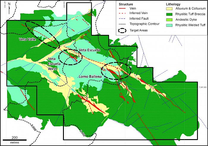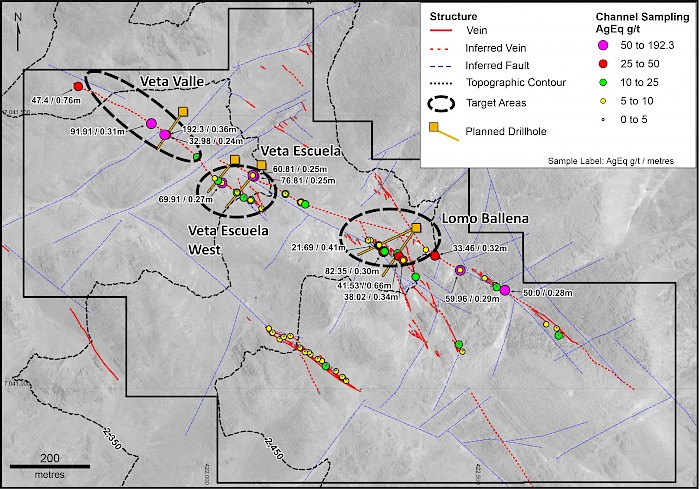 The 1,500m diamond drilling program, planned for Q1 2021, will target three of the most prospective zones along the principal Sandra trend, and initially test to a depth of 80 to 200m vertically below the outcropping surface exposures. These targets include Lomo Ballena (“LB”), Veta Escuela (“VE”) and Veta Valle (“VV”). The three targets, which represent the deepest eroded parts of the outcropping system (<2,450m ASL), show an overall increase in Au and Ag grades when compared with the higher elevation surrounding areas, and are considered geologically, structurally and geochemically strong targets for this initial drill program.