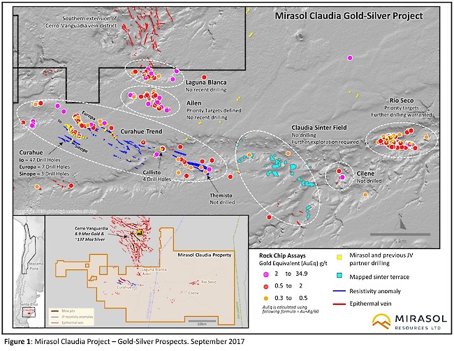 The Claudia Project (figure 1) is an extensive project which hosts five low sulphidation epithermal Au+Ag prospects with multiple drill-ready targets. The Claudia Project was staked as part of Mirasol’s Santa Cruz project generation strategy and was, until earlier this year, under an option/ joint venture agreement with the owner (CVSA) of the world class Cerro Vanguardia mine which adjoins the northern border of the Claudia claims. As outlined in the press releases dated February 17 and August 31st, 2017, CVSA drilled 7,525 m at the Claudia Project focusing on the Io vein, a 2.2 km long vein zone in the 15 km long Curahue prospect and completed a non – NI 43-101 compliant grade model. In addition to the Curahue prospect, Mirasol has identified four other prospects, some of which have outcropping strongly mineralized Au+Ag veins that have not been drill tested.