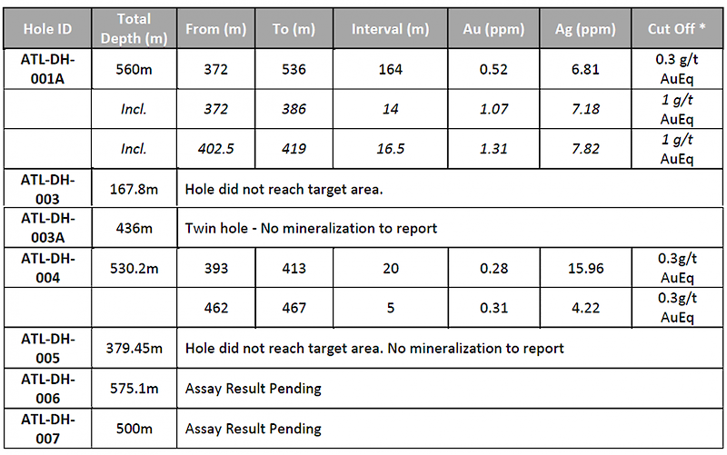 - ATL-DDH-001A: 164m @ 0.52 g/t Au and 6.81 g/t Ag from 372m, including: