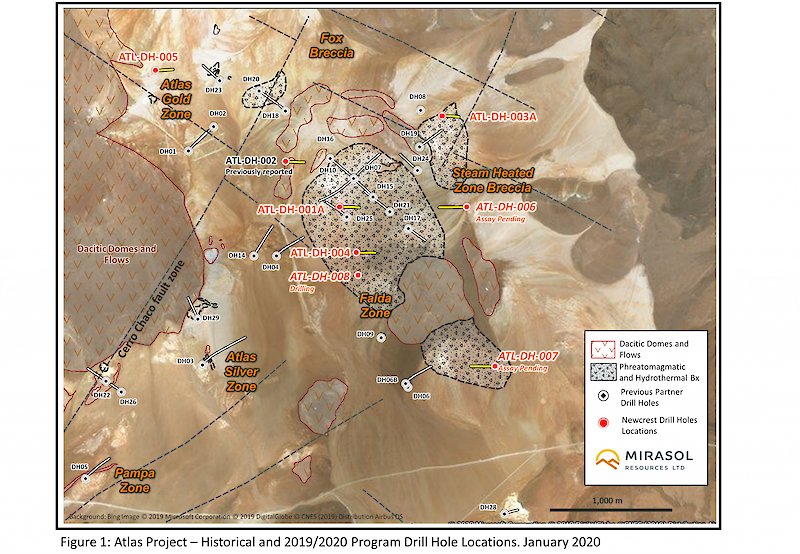 Norm Pitcher, President and CEO of Mirasol stated: “We continue to hit long intervals of alteration and mineralization at the Atlas property. While we have received encouraging assay results from the holes reported to date, the geologic interpretation of the results is at an early stage and will not be complete until results from the last few holes are available. As such, it is too early to conclude whether the Newcrest holes represent a lower grade halo around the higher-grade mineralization encountered in our previous partner hole DH15 or simply a lower grade portion of the main system. There are still significant untested gaps within the mineralized envelope of sufficient size to host a higher grade potentially economic core. We look forward to working with Newcrest as the project advances.”