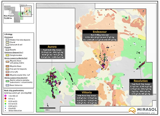Mirasol continues to consolidate its claims holdings at the Nico project where it now controls a 73,000 ha area of 100% owned contiguous claims, securing extensions of the volcanic complex related to mineralization.