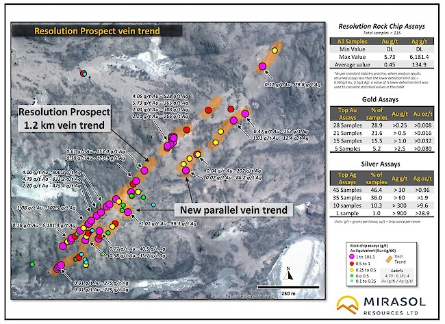 - The receipt of additional Au-Ag rock chip assay results which upgrade the Resolution Trend prospect.