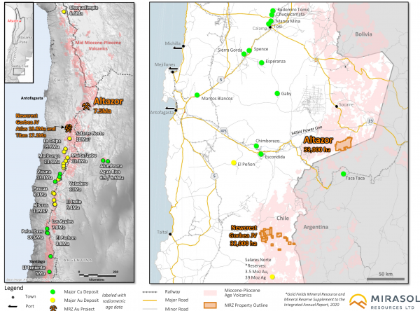 Mirasol believes the Chilean and Argentine sections of the Mio-Pliocene age mineral belt is highly prospective for world-class Au+Ag deposits as exemplified by the multi million-ounce discoveries by Gold Fields at Salares Norte and by Barrick Gold at Alturas.